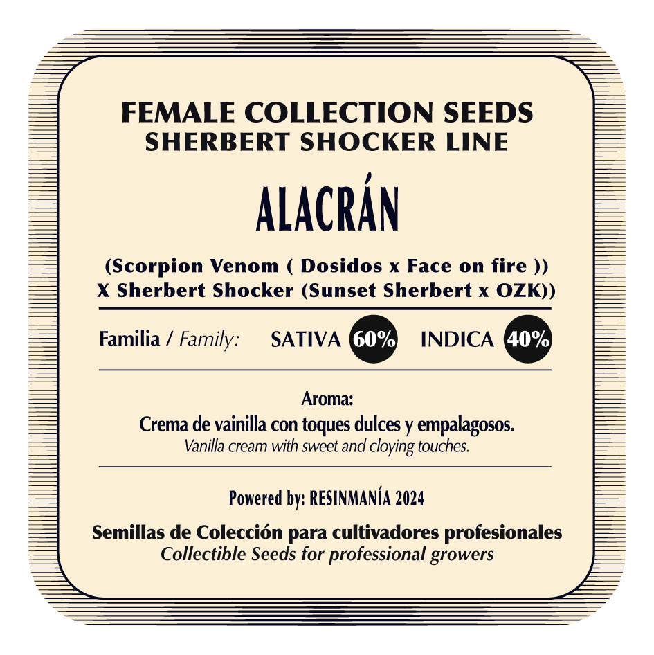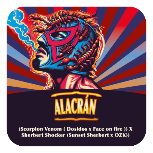 Alacrán es una genética intrigante y única que combina la riqueza y complejidad de dos variedades excepcionales. Creada por Black Tuna Seeds, esta variedad resulta del cruce entre Scorpion Venom (Dosidos x Face on Fire), conocida por su potencia y carácter vibrante, y Sherbert Shocker (Sunset Sherbert x OZK), famosa por su equilibrio y perfil cremoso.