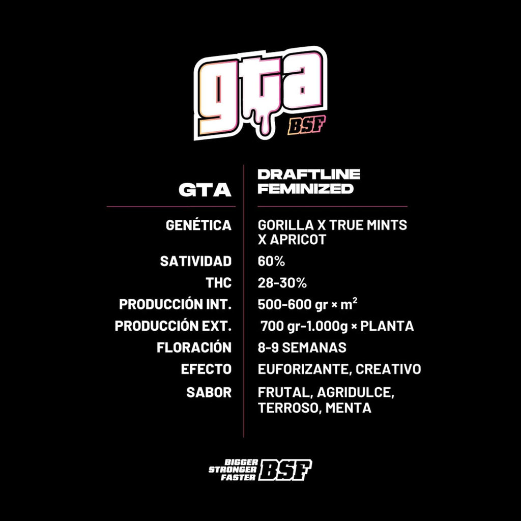 GTA Feminized, fruto de la combinación de Gorilla, True Mints y Apricot, destaca por su alto contenido de THC y una predominancia sativa del 60%.