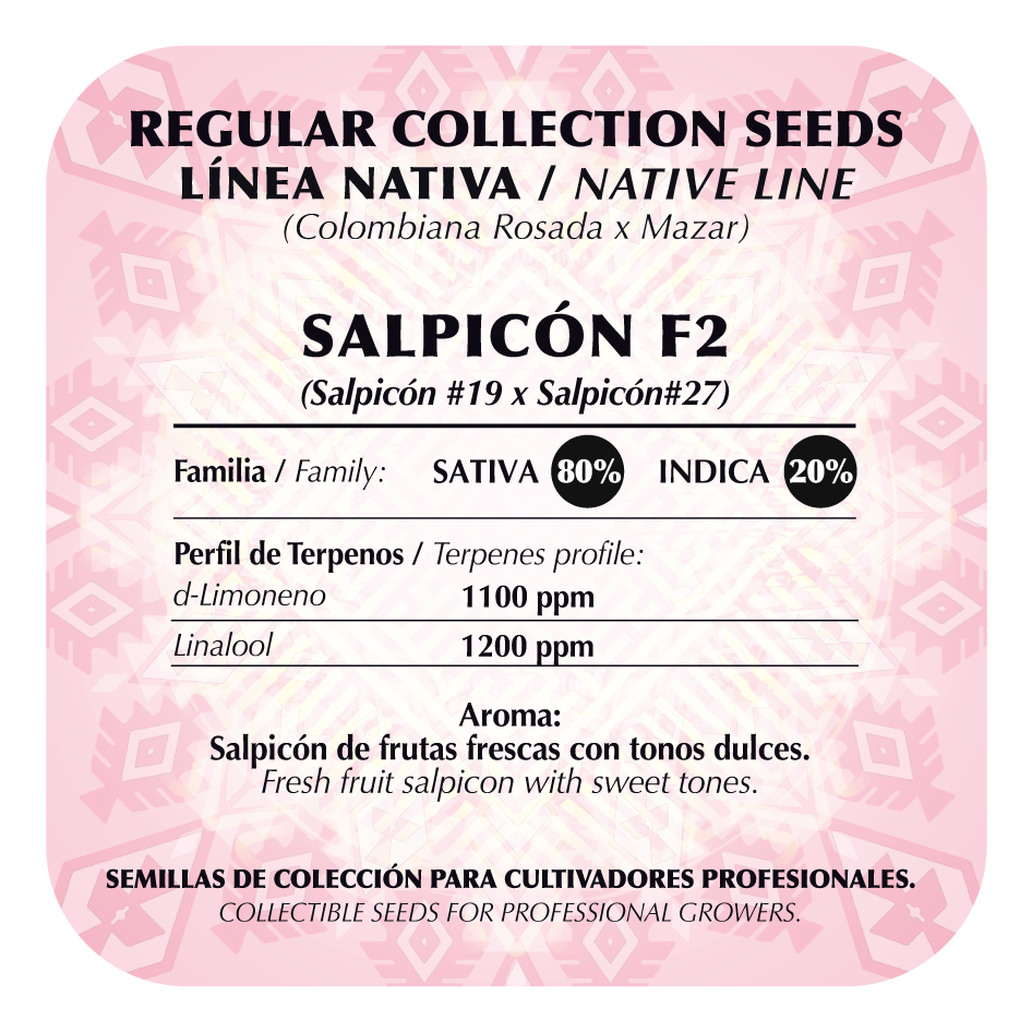 El hermoso híbrido Pheno Sparkies fue seleccionado para la creación de Salpicón F1. En esta segunda generación, los creadores querían resaltar aún más los terpenos de la bisabuela, Grape Zkittlez, sin perder la producción y la resistencia que ya caracterizan a Salpicón. Por esta razón, crearon esta segunda generación filial para poder acceder a esos genes recesivos tan admirados de sus ancestros.