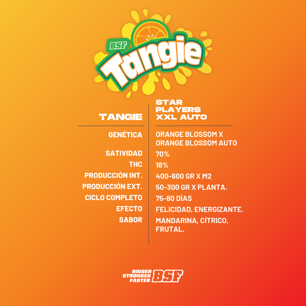 Tangie XXL auto, es una mezcla de genetica Orange Blossom por el clon elite de BSF, auto de 3ra generación, logrando una planta de porte medio-alto, alta producción y fácil cultivo.