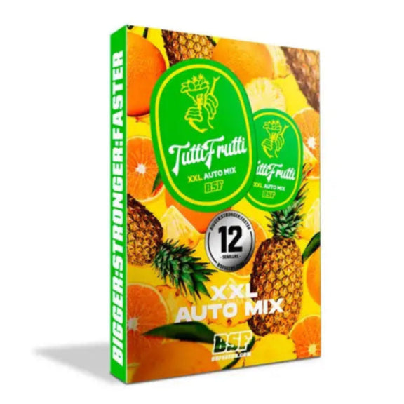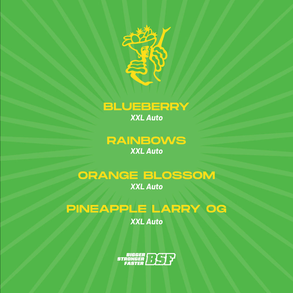 BSF Seeds presenta el Tutti Frutti XXL Auto Mix, una explosión de sabor que combina cuatro de sus variedades automáticas más frutales: Auto Blueberry, Auto Rainbows, Auto Orange Blossom y Auto Pineapple Larry OG. Esta mezcla increíble ofrece una variedad de terpenos en burbujas separadas.